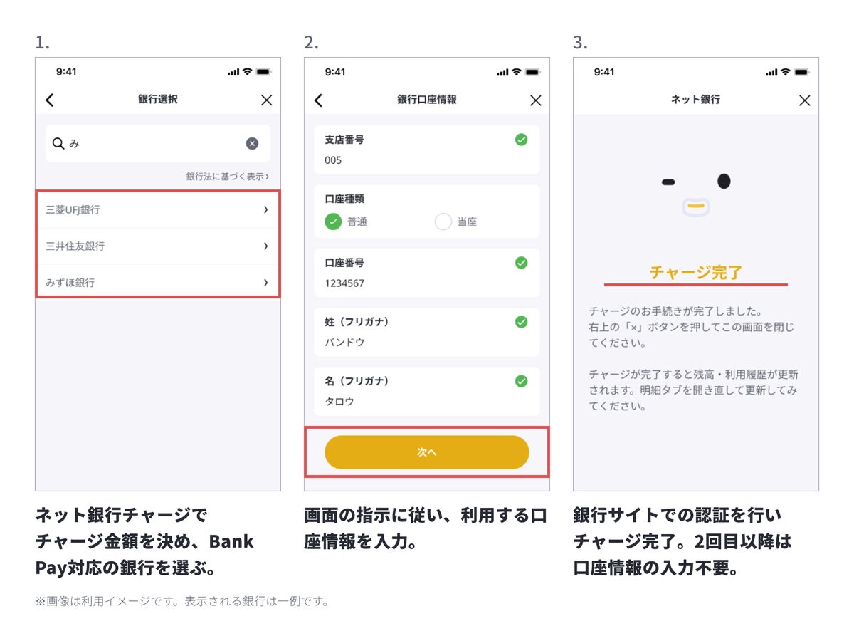 対応金融機関を利用するユーザーは、Bank Payに自身の情報と金融機関を登録することで、毎回の情報入力なしで簡単にチャージできるようになります。