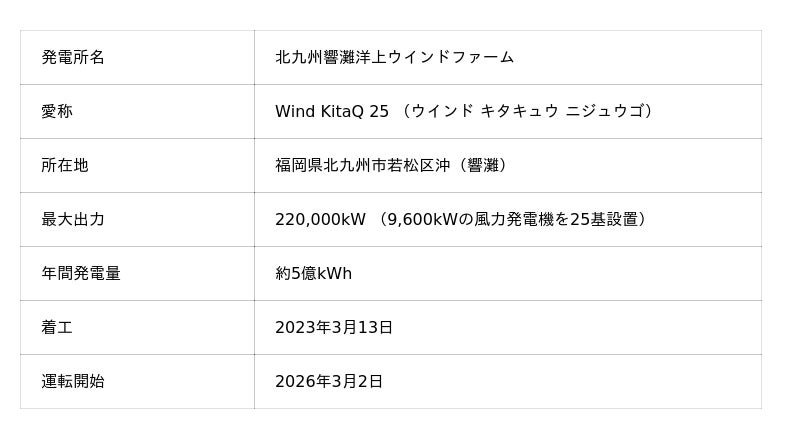 九電みらいエナジー株式会社、電源開発株式会社、北拓株式会社、西部瓦斯株式会社、株式会社クラフティアが共同出資する事業会社「ひびきウインドエナジー株式会社」を通じて建設を進めてまいりました「北九州響灘洋上ウインドファーム」が、本日3月2日より営業運転を開始いたしました。