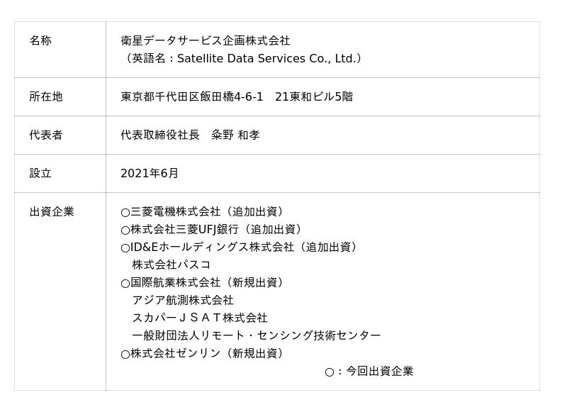 三菱電機株式会社(本社:東京都千代田区、執行役社長:漆間 啓、以下:三菱電機)、株式会社三菱UFJ銀行(本社:東京都千代田区、取締役頭取執行役員:半沢 淳一、以下:三菱UFJ銀行)、ID&Eホールディングス株式会社(本社:東京都千代田区、代表取締役社長:新屋 浩明、以下:ID&Eホールディングス)、国際航業株式会社(本社:東京都新宿区、代表取締役 社長執行役員:藤原 協、以下:国際航業)、株式会社ゼンリン(本社:福岡県北九州市、代表取締役社長:竹川 道郎、以下:ゼンリン)の5社は、2月27日に衛星データサービス企画株式会社(本社:東京都千代田区、代表取締役社長:粂野 和孝、以下:SDS)へ出資しました(※1)。それに伴い、SDSは事業会社化し、「衛星データサービス株式会社」として、4月から始動予定です。
