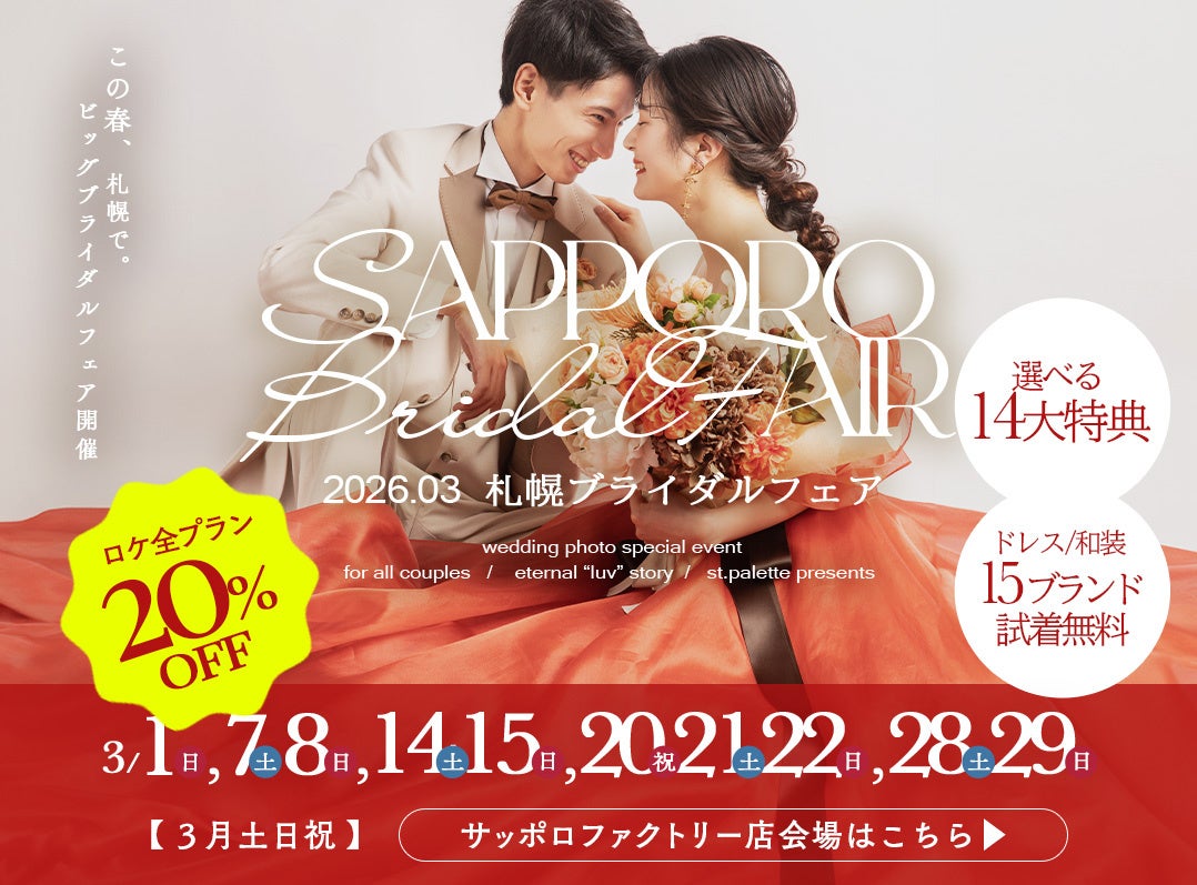 この度、2026年3月土日祝限定で、お得で楽しいブライダルフェアを札幌エリアの店舗で開催します。運命の一着を探している方、憧れのドレスを試着したい方は、この機会にぜひご来店ください。
