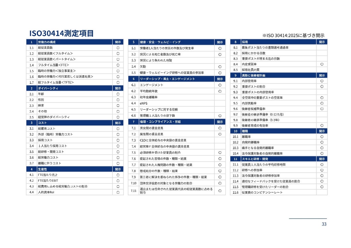 ■ 69指標中55指標を開示本レポートでは、ISO 30414:2025で定義される69指標のうち55指標を開示しています。