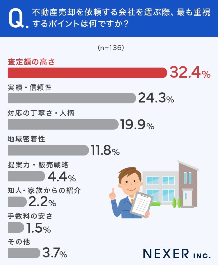 今回の調査では、不動産売却における会社選びの実態が明らかになりました。最も重視されるポイントは「査定額の高さ」でしたが、「実績・信頼性」「対応の丁寧さ」を合わせると4割を超え、金額面だけでは測れない要素も大きいことがわかります。