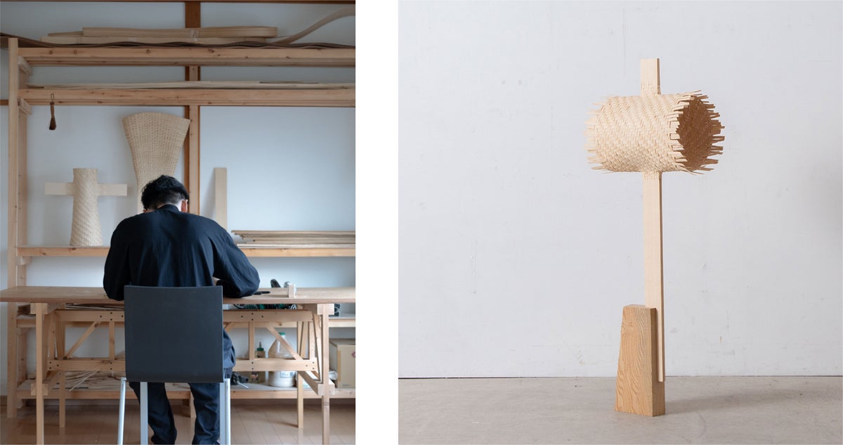 工芸的背景をもつ編み籠と量産的背景をもつ合板を編み上げる佐藤伸昭は、2mに及ぶ大型作品を展示します。また、会場には、Tokyo Productによる熊本県産イグサのチェアを設置。作品と向き合う時間に、静かな奥行きを添えます。