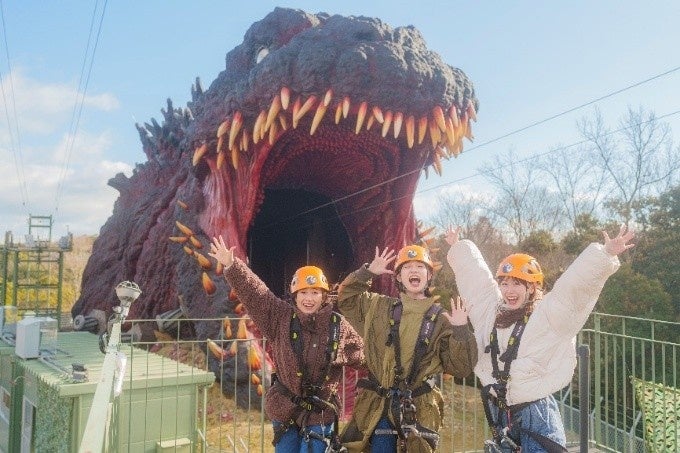 今回開催する春のジップラインキャンペーン「春のペアジップライン ~ゴジラを監視!記録写真をUPせよ!~」では、通常は1名ずつのスタートとなっている「体内監視」コースにて、期間中の11:00~17:00で2名一緒にスタートすることができるようになります。「体内監視コース」は、全長約120mの実物大ゴジラの口から体内に侵入することができるスリル満点のジップラインコースです。