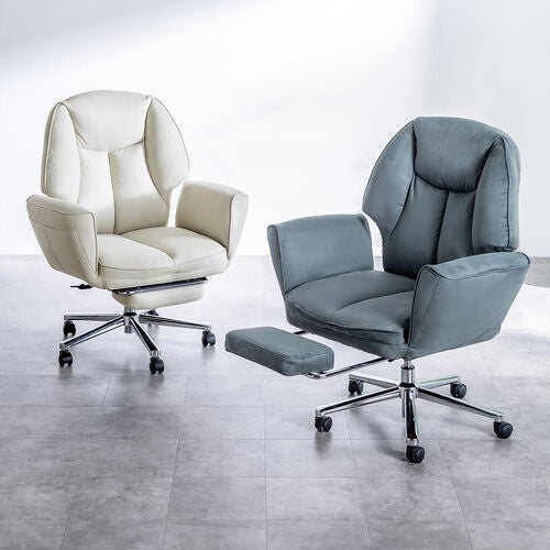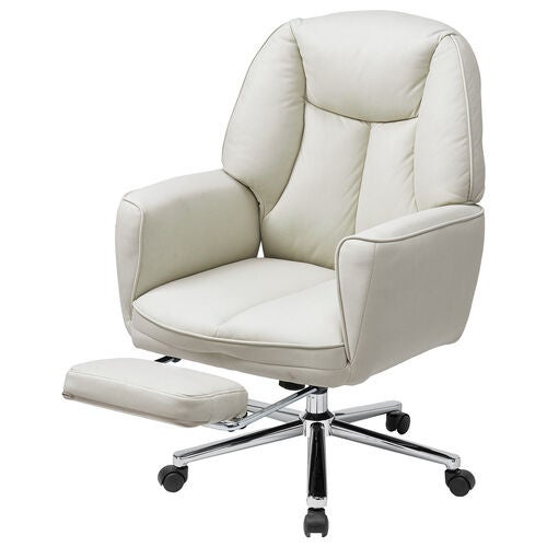 座面の下には、必要な時にサッと引き出して使える収納式オットマン(フットレスト)を備えています。足をまっすぐ伸ばして乗せることができるため、全身をリラックスさせたい時に大活躍します。使わない時は座面下にコンパクトに収納できるため、普段のデスクワークの邪魔にならず、見た目もすっきりスマートです。