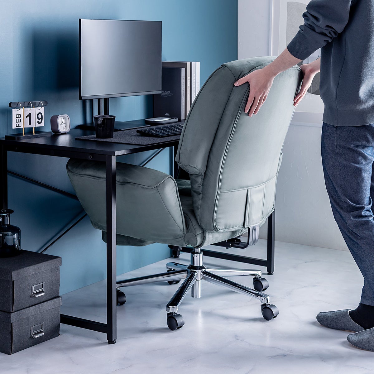 座面や背もたれには、弾力性のあるウレタンフォームを使用した肉厚クッションをたっぷりと採用しています。長時間のデスクワークでも疲れにくく、まるでソファに座っているかのような安心感のある座り心地を実現しました。頭までしっかり支える十分な高さがあり、体全体をやさしくしっかりと受け止めます。