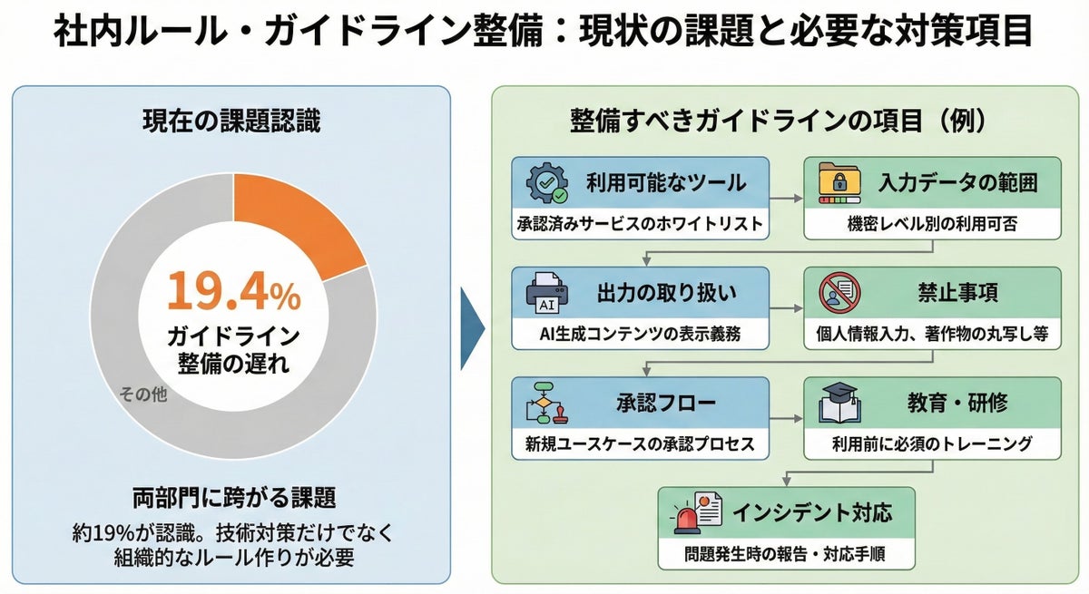 ツールを導入しても使いこなせる人材がいない、ルールがないまま展開するとリスクが増大する--という二重苦が、全社展開のブレーキになっています。体系的な研修プログラムの整備と、禁止事項を明記した最低限のガイドラインを段階的に展開するアプローチが求められています。