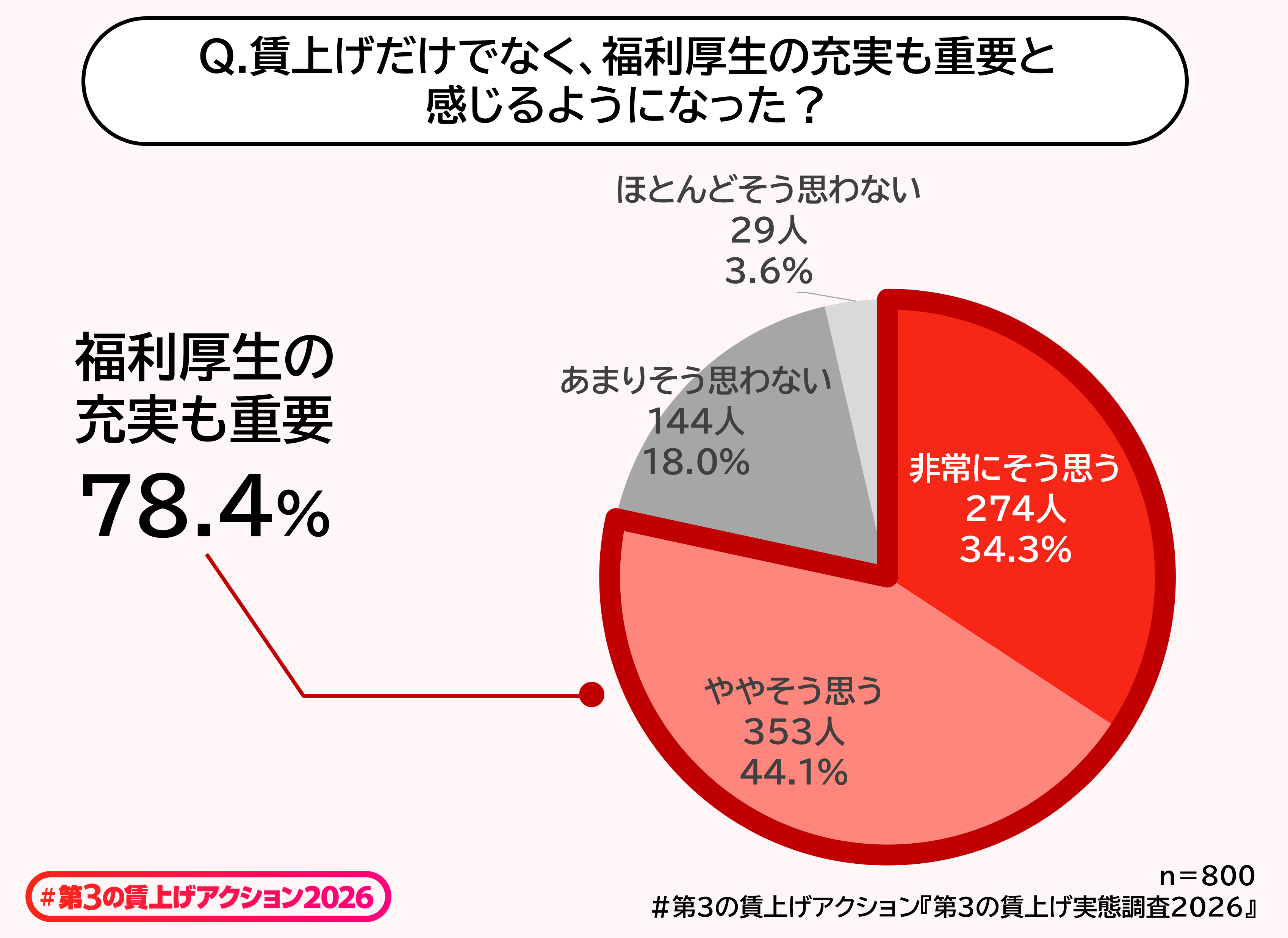 こうした中、企業規模を問わず導入が進んでいるのが福利厚生を活用した新たな賃上げ手法「第3の賃上げ」です。第3の賃上げとなる福利厚生を通じた実質的な賃上げは、企業規模を問わず少額でトライしやすいこと、さらに会社からのメッセージ性が高いことから、エンゲージメントや採用力アップに貢献するなどメリットも多く、人材課題に直面する企業から高い評価をいただいています。昨年12月の調査※2では、8割近くが「賃上げだけでなく“福利厚生”も重要」と回答しました。