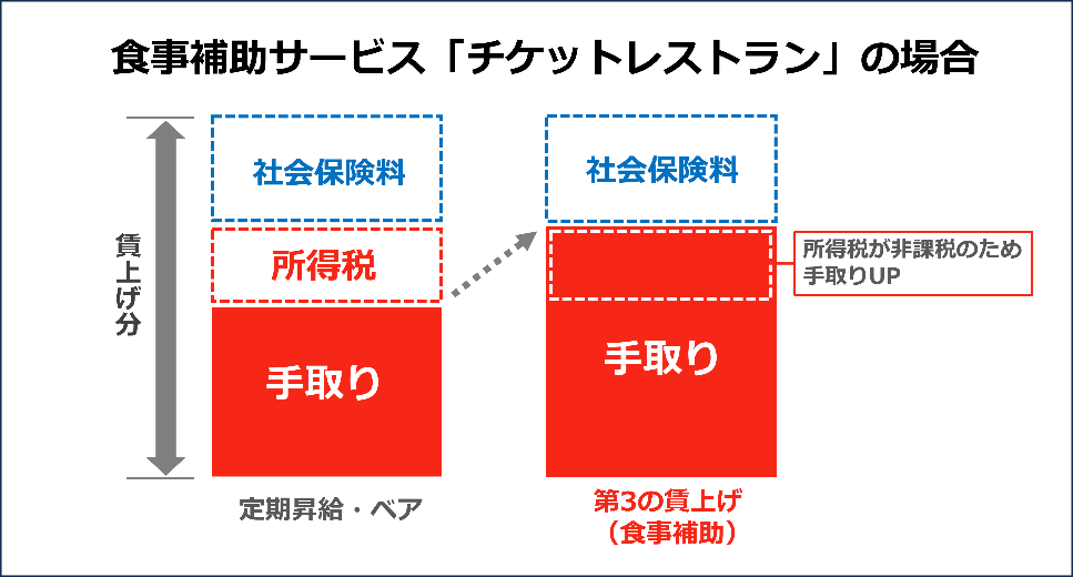 給与が増加する「賃上げ」は、増加分だけ税金や社会保険料の負担額も増加します。一方、食事補助、社宅などの福利厚生費は、一定の要件を満たせば、非課税で処理でき、また制度によっては社会保険料にも影響しないため、給与で還元するよりも従業員は実質手取りを増やすことができます。加えて企業は、全額経費扱いにできるため、税負担の軽減につながります。