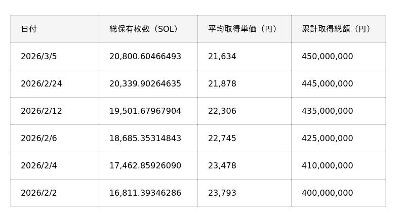 当社は引き続き、当初予定している5億円規模のSOL取得に向けて、市況を踏まえた適切なタイミングでの購入を進めるとともに、中長期的なSOLの価値向上を見据え、ステーキングやバリデータ運用をはじめとした施策を通じて、保有するSOL数量の拡大を図ってまいります。