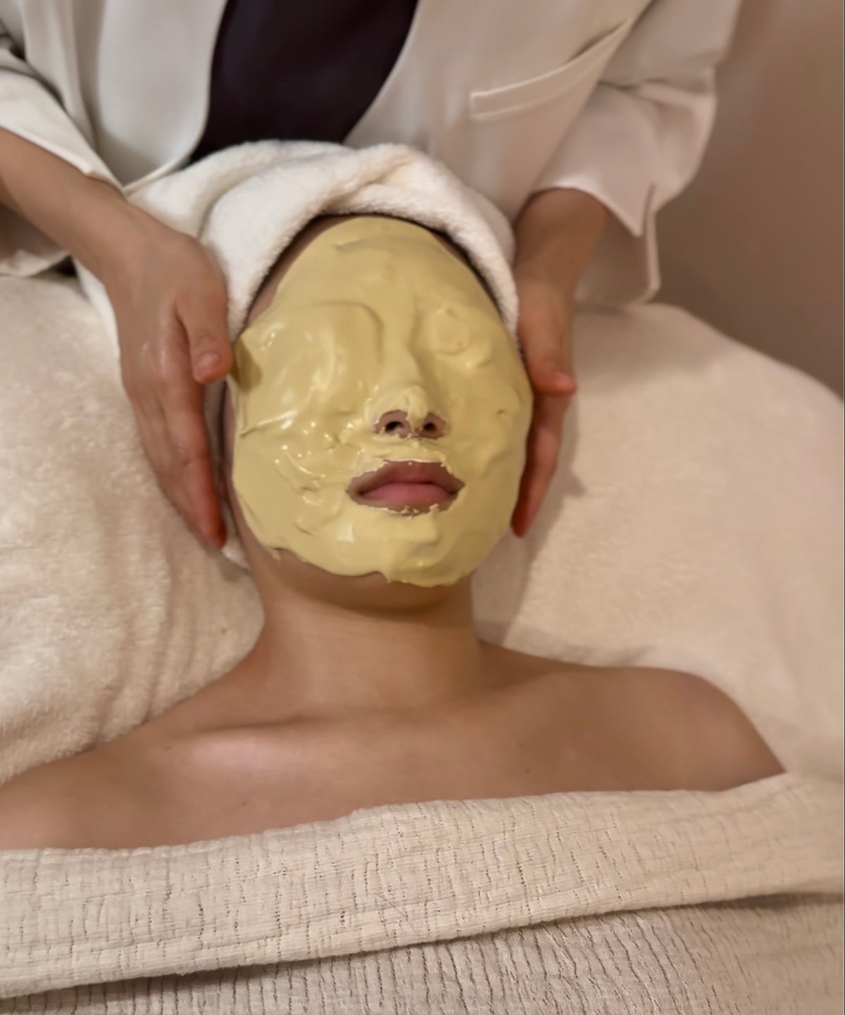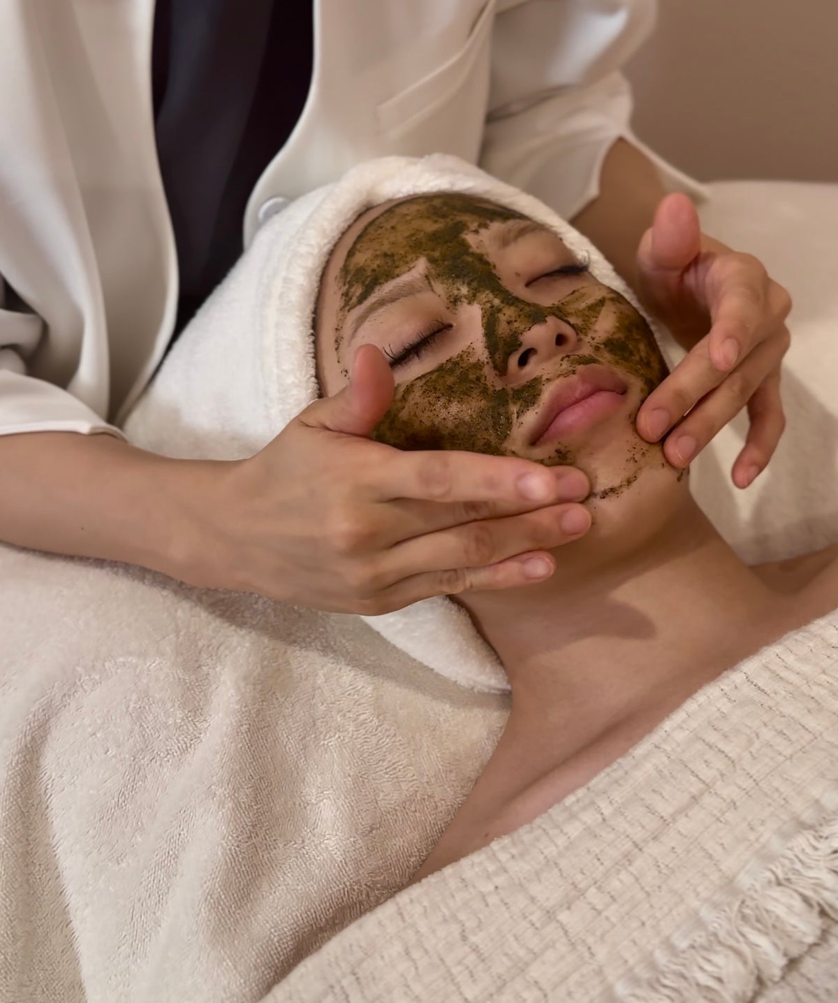 ハーブピーリング後に行うモデリングパックも、も、ブライダルケアとの相性が良い施術です。肌を密着して包み込みながら鎮静・保湿・透明感ケアを同時に行える点が特徴です。
