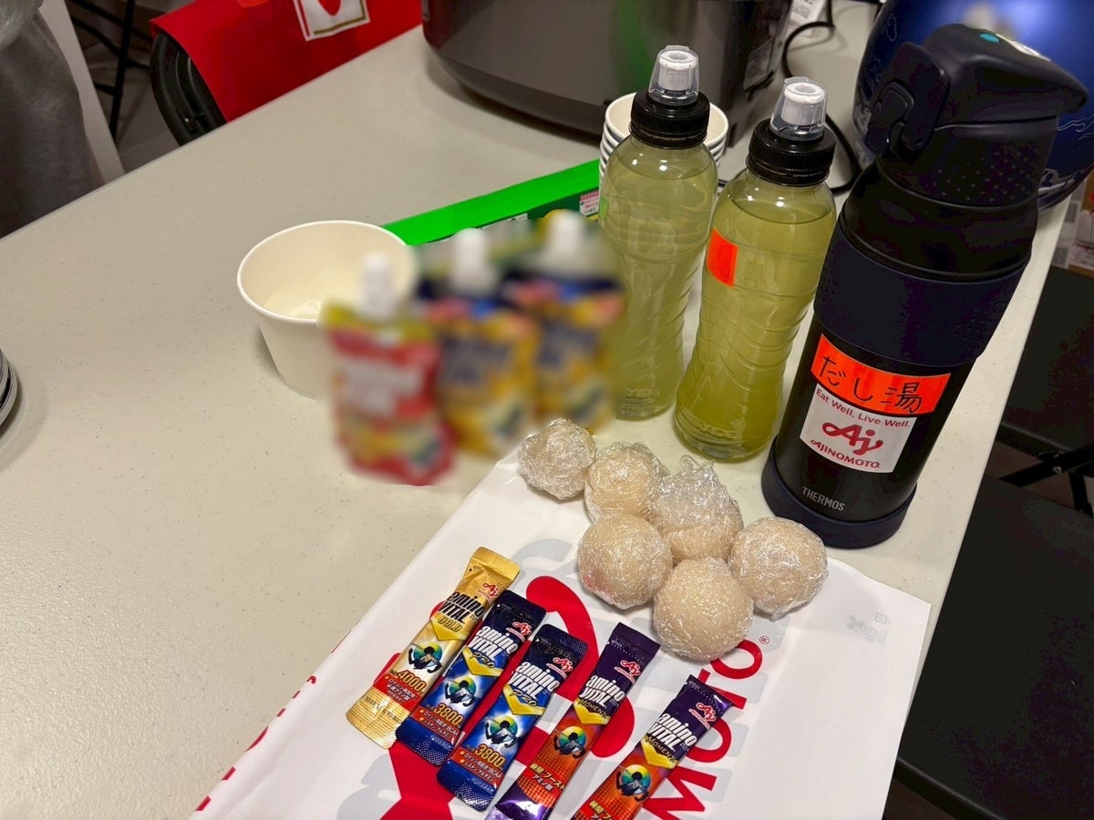 練習拠点であるヴァレーゼでの食事・補食サポートと、団体戦直前の決起集会を企画・運営いたしました。冷え込むリンクで人気があったのは「だし湯」。お湯に「ほんだし(R)」を溶かしたシンプルなものですが、かつおの風味が感じられ、「染みる...」という声も。