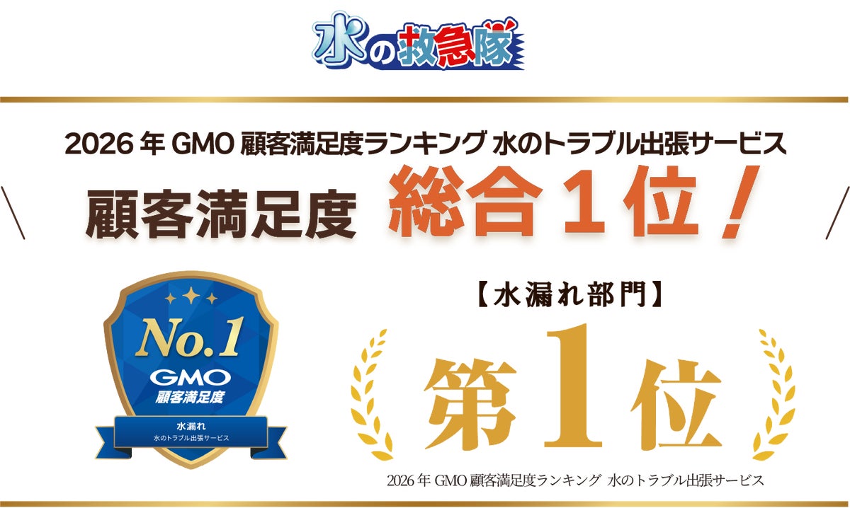 国内全域で24時間対応の駆け付け水道修理サービスを提供する株式会社クリアライフ(代表取締役社長:山下雄一)が運営する水の救急隊は、GMOリサーチ&AI株式会社(本社:東京都渋谷区)が発表した「2026年GMO顧客満足度ランキング」の水のトラブル出張サービス 水漏れ部門において、顧客満足度 総合第1位を獲得いたしました。