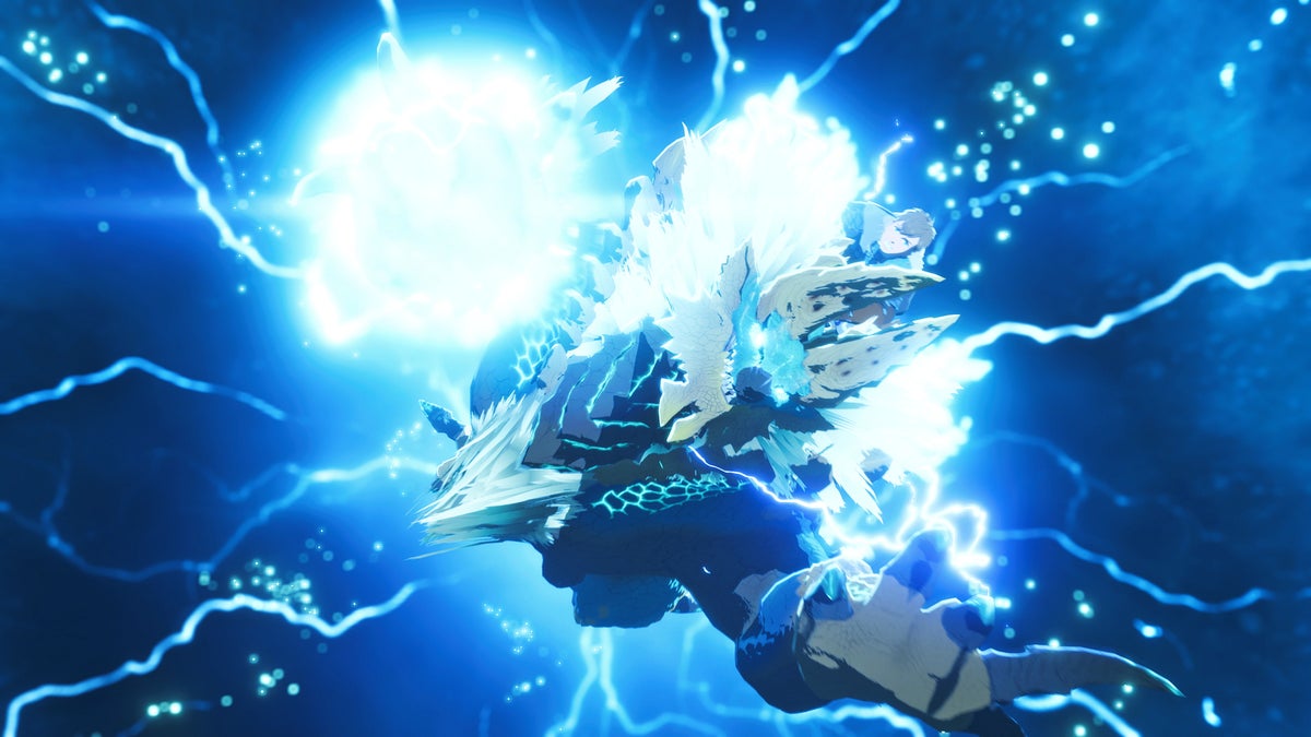 蒼白い雷光をその身に纏う姿から「雷狼竜」とも呼ばれる牙竜種。蓄電殻と称される甲殻や帯電毛などを活用し、極限まで電力を宿した状態は「超帯電状態」と呼ばれ恐れられている。碧色の甲殻は、溢れる電気から自らを守る絶縁体の役割を持つ。また、無数の甲殻に覆われた分厚い尻尾は、外敵を排除する武器であり、かつ巨躯を制するバランサーの役目も担っている。
