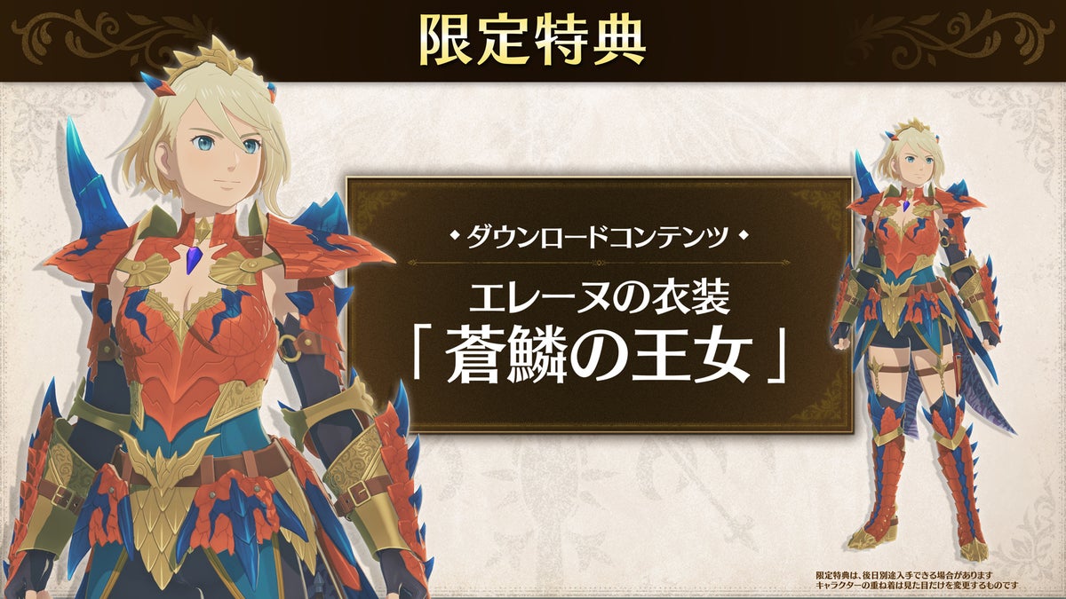 そのほか特定の「モンスターハンター」シリーズのセーブデータがゲーム機本体に保存されている場合、ゲームを起動すると主人公の見た目を変更できる「重ね着装備」が手に入る。