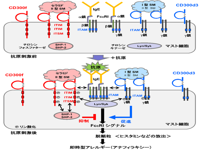 SMは機能的に、I型<CD300d3に結合するがCD300fに結合しない>とII型<CD300d3とCD300fに結合する>に分けられ、I型SMとII型SMはともにマウスの皮膚真皮に存在します。マスト細胞表面にはFcεRIとともにCD300fとCD300d3が発現しています。定常状態では、セラミドとII型SMが結合するCD300fとI型SMとII型SMが結合するCD300d3が存在します。このとき、CD300d3と会合するγ鎖(FcεRIのγ鎖と同じ分子)のITAMやCD300fのITIMやITSMはリン酸化されていません。抗原特異的IgEはFcεRIのα鎖に結合しますが、それだけでFcεRIシグナルは起動しません。抗原が加わり、IgEを介してFcεRIを架橋すると、FcεRI直下のチロシンキナーゼ(LynやSyk)が活性化し、FcεRIのβ鎖やγ鎖のITAMをリン酸化します。これが引き金となり、FcεRIシグナルは下流に伝わり、マスト細胞は活性化します。放出される顆粒はヒスタミンを含み、マウスの皮膚の血管透過性を亢進させて皮膚アナフィラキシーを誘導します。このとき、セラミドやII型SMが結合しているCD300fは架橋されたFcεRIに近づくため、直下で活性化したLynやSykがCD300fのITIMやITSMをリン酸化します。そこに動員されるチロシンフォスファターゼ(SHP-1やSHP-2)がFcεRIシグナルを抑制します。他方、I型SMやII型SMが結合しているCD300d3も架橋されたFcεRIに近づくため、活性化したLynやSykはCD300d3の会合するγ鎖のITAMもリン酸化してFcεRIシグナルを促進します。つまり、CD300d3とCD300f はFcεRIの活性化シグナルを正負に制御し、それぞれアクセルとブレーキの役割を果たします。また、I型SMリポソームを投与するとCD300d3シグナルを介してアナフィラキシーは増強し、セラミドリポソームを投与するとCD300fシグナルを介してアナフィラキシーは抑制されます。興味深いことに、CD300d3とCD300fの両方に結合するII型SMリポソームを投与するとアナフィラキシーは抑制されます。つまり、II型SMの存在下では、CD300fの抑制シグナルはCD300d3の活性化シグナルを凌駕します。したがって、I型SMはCD300d3を介してアナフィラキシーを促進し、セラミドとII型SM はCD300fを介してアナフィラキシーを抑制し、このバランスがアナフィラキシーの強さを決めると考えられます。
