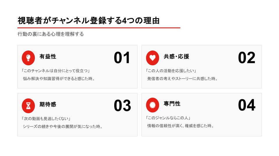 - 専門性「このジャンルについて、このチャンネルは信頼できる」と感じた時。