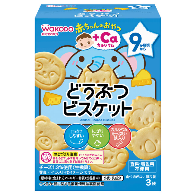 ・「鉄入りビスケット」「どうぶつビスケット」は、口どけしやすいなめらかでやさしい食感にリニューアルしました。「鉄入りビスケット」はにぎりやすいスティックタイプ、「どうぶつビスケット」はどうぶつの絵柄入りのつまみやすい形状で、手づかみ食べの練習にもピッタリです