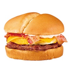 風味良く燻製し、カリカリに焼き上げたベーコンとタマゴ、濃厚なチェダーチーズを組み合わせた、朝の食欲を満たすのにぴったりの1品。ビーフ100%パティとベーコンの旨味が食欲をそそります。