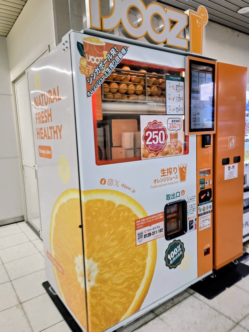 科学的にも、オレンジに含まれるビタミンCは60~70℃、フレッシュな香気成分は40~50℃で揮発・分解が加速するとされています。IJOOZは加熱殺菌工程を挟まないその場での「生搾り」に特化することで、フルーツ本来のポテンシャルをカップに無添加で閉じ込めます。日々の生活をアップデートする一杯として、ビタミンチャージなどの健康に貢献しています。今後、自販機サイネージ等を通じて以下のベネフィットを発信してまいります。「 ビタミンチャージ + 天然の栄養と香り + クエン酸 + ポリフェノール 」