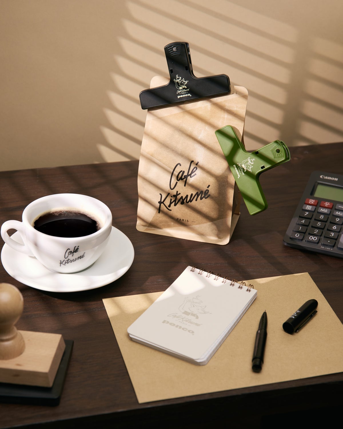 今回Cafe KitsuneとPenco(R)による初めてのコラボレーションとして、限定のステーショナリーカプセルを展開します。コーヒーカルチャーと日本のクラフトマンシップを融合させたオフィスエッセンシャルのセレクションには、スパイラルノート、ミニマルなクリップ、ボールペンや鉛筆など、細部までこだわったアイテムがラインナップされています。