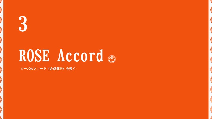 本イベントでは、香りを「嗅ぐ」「学ぶ」「混ぜる」という実践を通じて、構造的に香りを理解する実践形式の講座を実施します。調香において最も重要な「アコード」をテーマに、綿密な香料同士の結びつきが起こすシナジーを自らの手でデザインすることを目指します。単に教科書的な正解を知るのではなく、素材と向き合い、その奥深さを楽しむ学びと実践体験は、まるでシェフのクラスルームに参加するような感覚で、プロの技術と思考に触れていただけます。