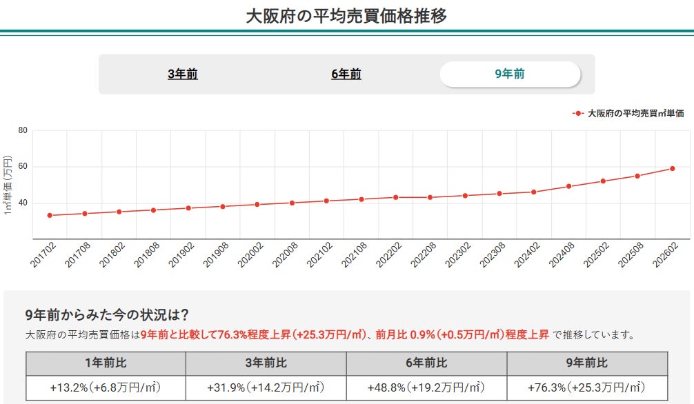 2.2026年2月時点で、大阪府全体の中古マンション平均売買平米単価は9年前と比べて76.3%上昇。長期にわたり右肩上がりのトレンドが継続