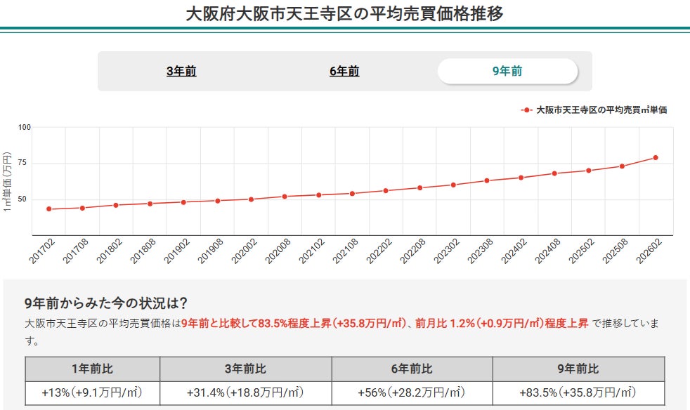 平米単価自体の額面は東京が勝りますが、「価格の伸びしろ」という観点では、大阪市天王寺区は非常にポテンシャルの高い市場であると言えます。