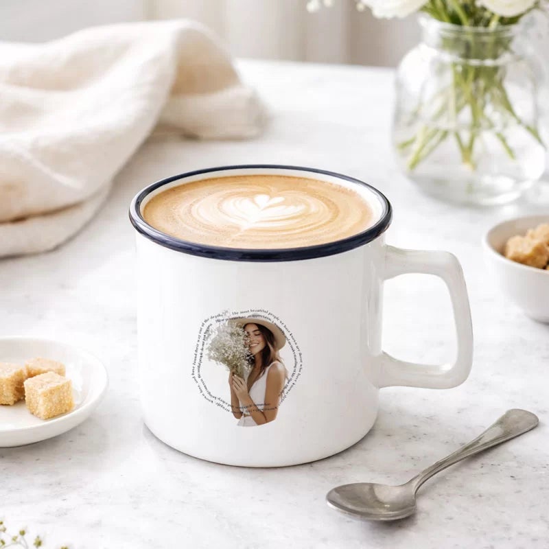 見た目は懐かしいホーロー風、実際は陶器製でしっかりとした質感。口元の差し色がアクセントになり、写真映えする“ほっこり可愛い”オリジナルマグに仕上がります。