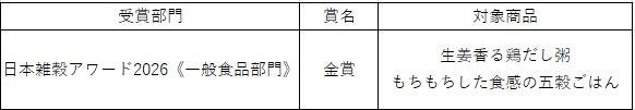 穀物のリーディングカンパニー株式会社はくばく(本社:山梨県中央市、代表取締役社長:長澤 重俊)は、一般社団法人日本雑穀協会が主催する「日本雑穀アワード2026《一般食品部門》」にて、『生姜香る鶏出だし粥』、『もちもちした食感の五穀ごはん』の2品が“金賞”を受賞いたしました。