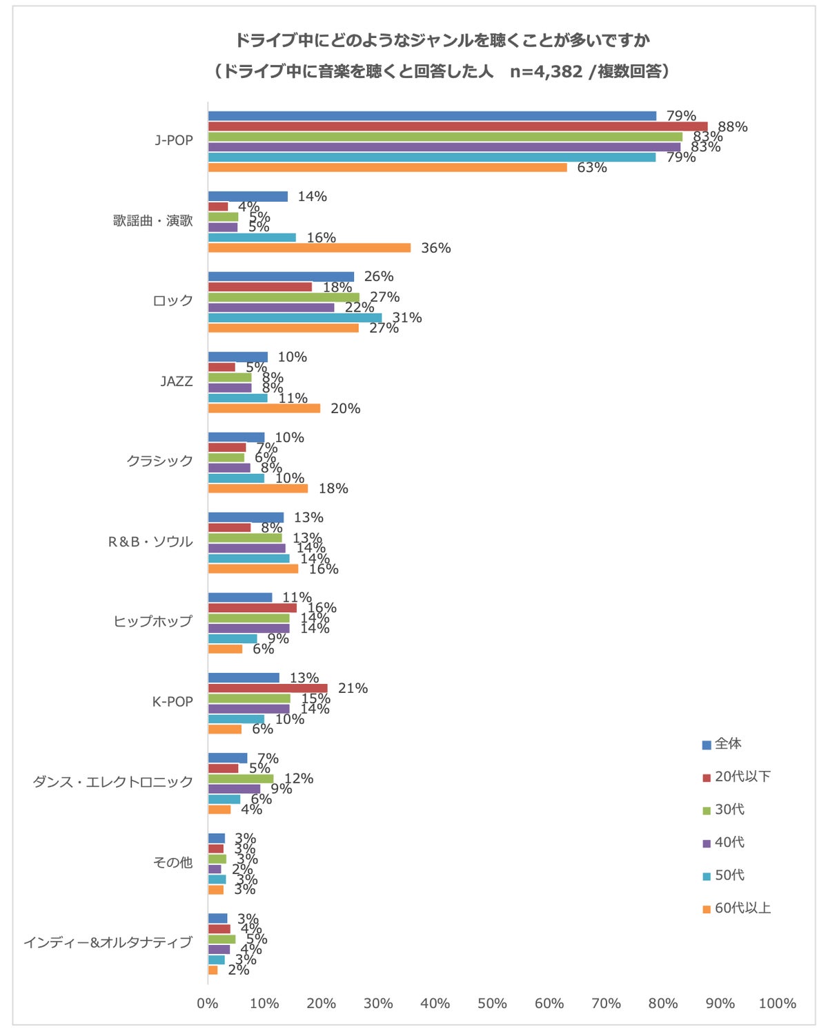 年代別に見ると、20代以下・30代・40代では「K-POP」がTOP3にランクイン。一方、50代・60代以上では「歌謡曲・演歌」の人気が高く、年代による嗜好の違いが見られました。また、「J-POP」「ロック」は全ての年代でTOP3に入り、ドライブ中の音楽として世代を問わず幅広く支持されているようです。