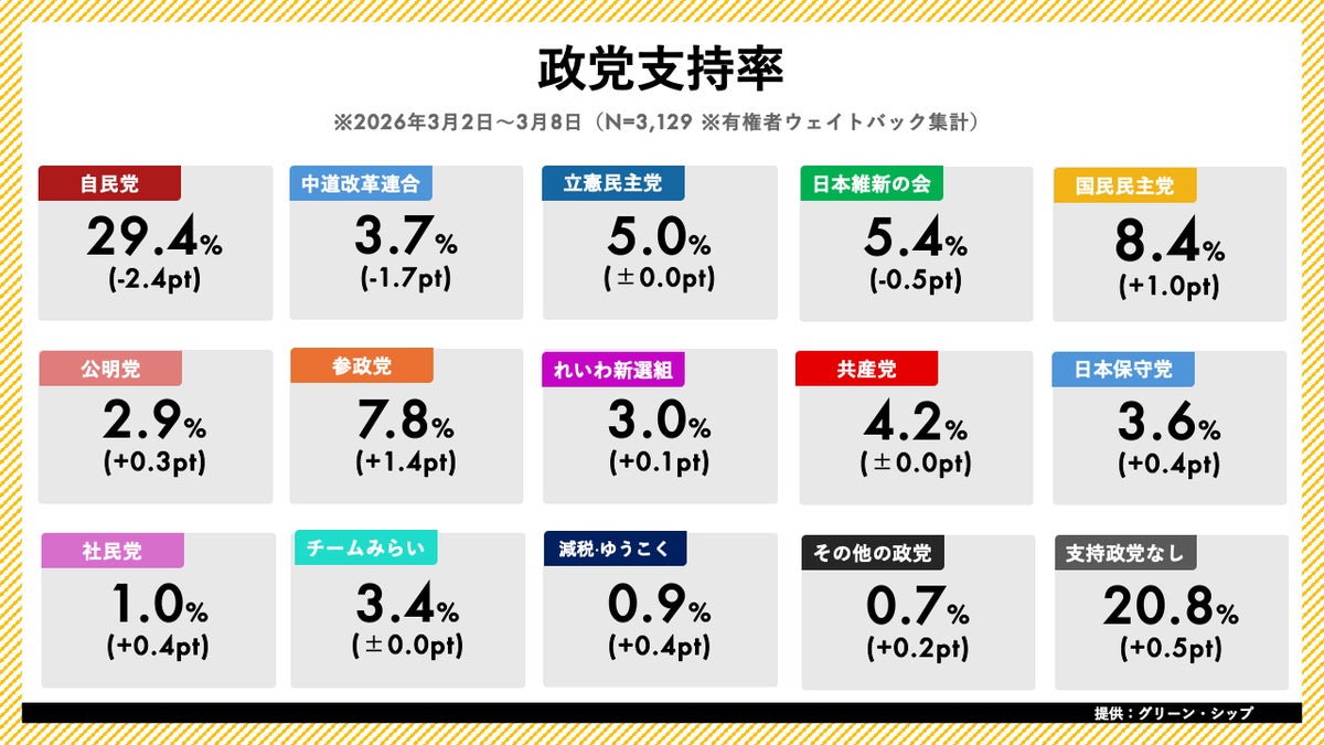 ジャッグジャパン株式会社(本社:東京都渋谷区)は、株式会社グリーン・シップ(本社:東京都千代田区)と業務提携し、グリーン・シップが提供する日次世論調査「世論レーダー」のデータを提供しております。本日、2026年3月第2週(3月2日~3月8日分)の内閣支持率・政党支持率調査の結果を発表いたします。