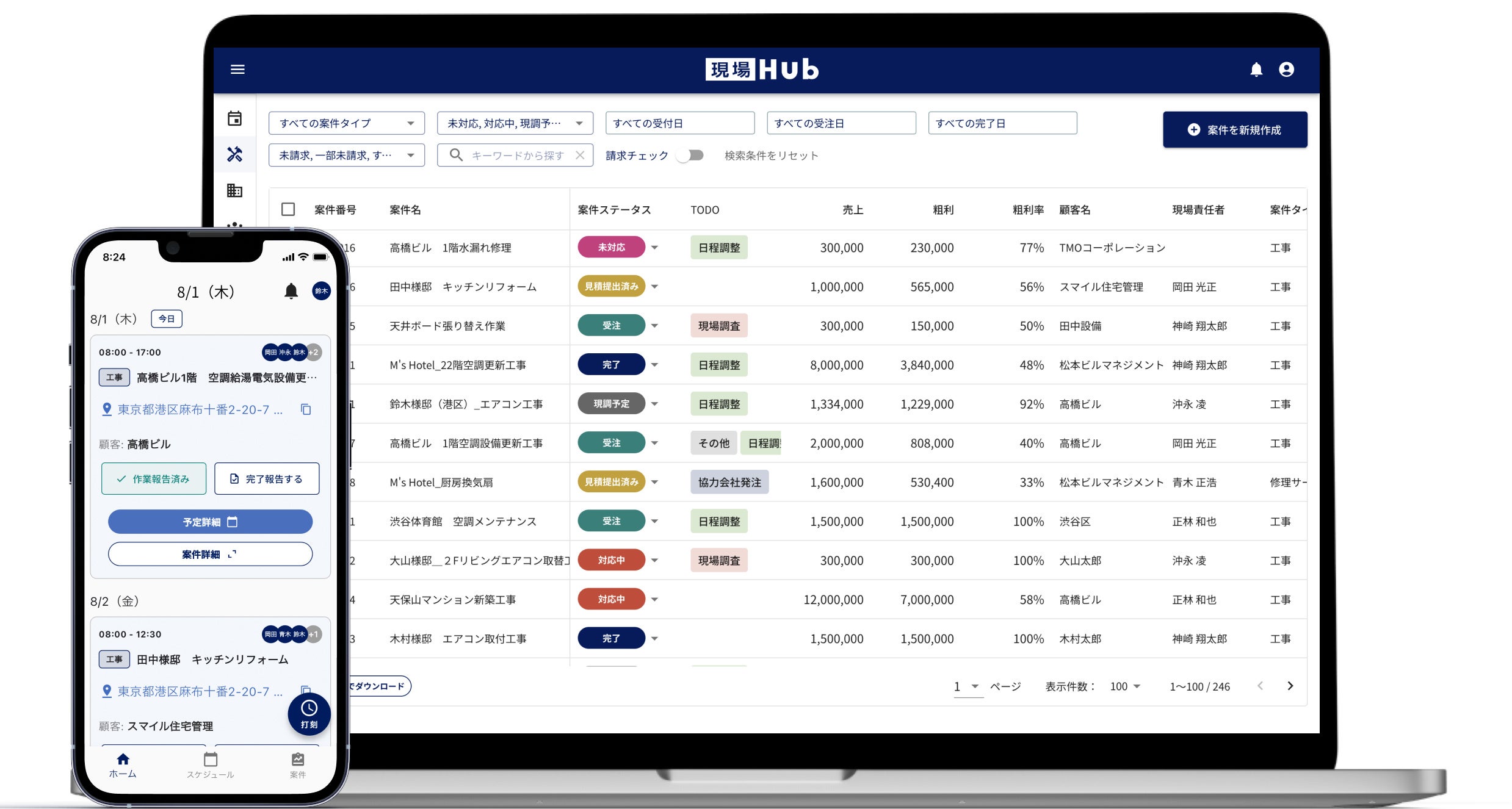 現場Hubは、案件進捗、予定、写真、報告などのあらゆる現場情報の一元化を実現するクラウド型業務管理システムです。PCとスマートフォンで直感的に操作でき、ITツールに不慣れな方や年配の方にも安心してご利用いただけます。日々の業務効率を劇的に向上するとともに、現場情報の蓄積・活用によるスピード感ある顧客対応や保守・更新工事の提案による売上向上にも貢献します。