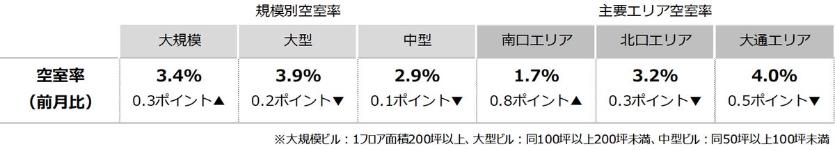 空室率は前月比プラス0.07ポイントの3.30%となり、前月から小幅に上昇した。新築ビルがまとまった面積の空室を抱えて竣工し、主な上昇要因となっている。エリア別では「南口」が前月比プラス0.8ポイントの大幅な上昇となった。潜在空室率は前月比プラス0.16ポイントの4.84%だった。