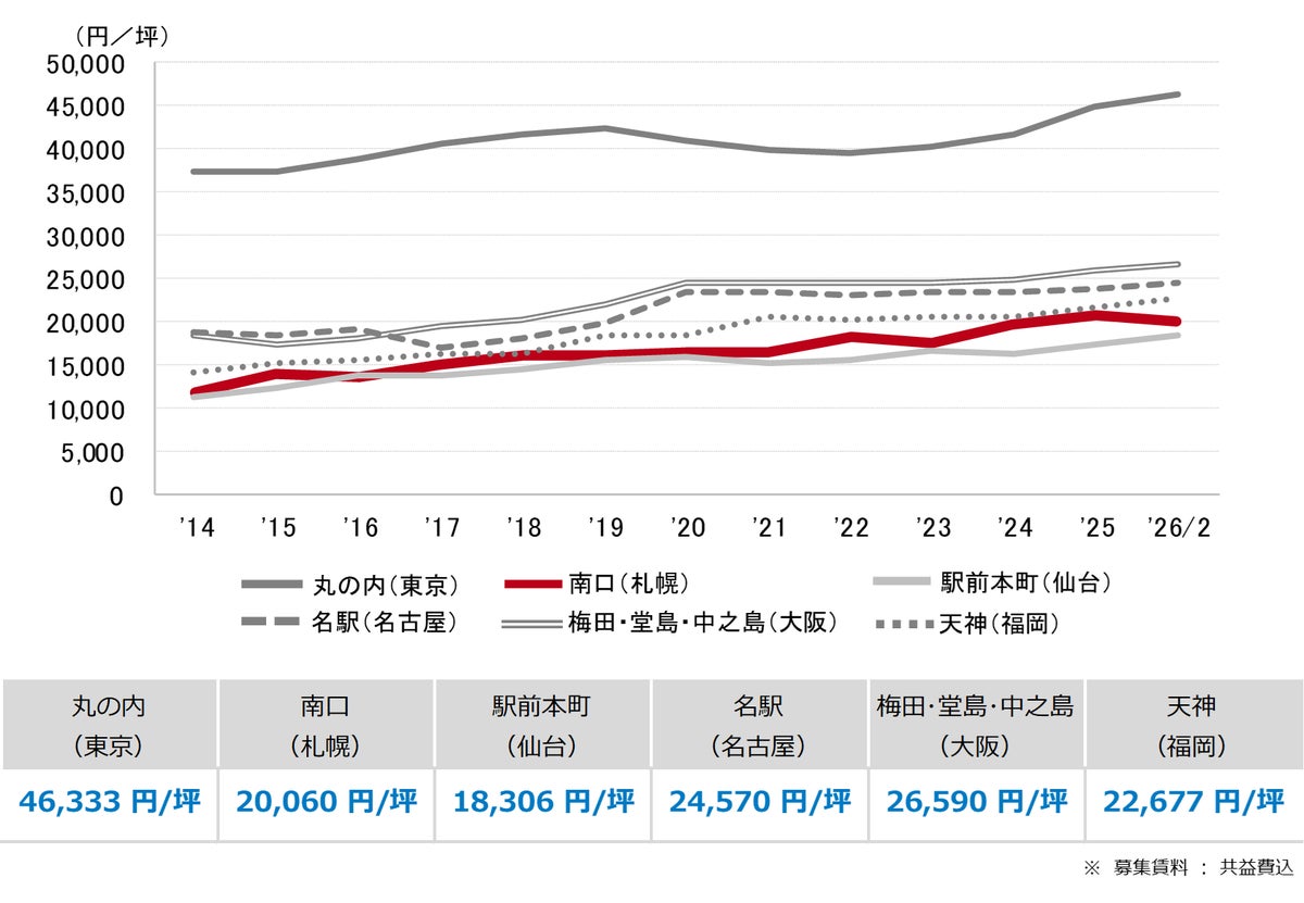 三幸エステート株式会社(本社:東京都中央区、取締役社長:福島正二郎)は、2026年2月度の札幌市オフィス賃貸状況(空室率&現空面積:全規模、募集賃料&募集面積:全規模、規模別空室率、主要エリア※1空室率:全規模)および全国6大都市(東京・札幌・仙台・名古屋・大阪・福岡)の大規模ビルのマーケットデータをまとめた「オフィスマーケット2026年3月号札幌」を公表します。