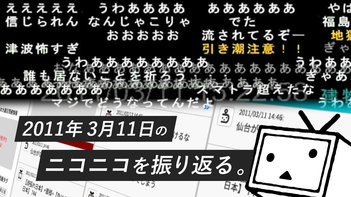 翌日3月11日(水)は、東日本大震災追悼復興祈念式の模様を現地会場の福島県より生中継するほか、震災当時(2011年3月11日)にニコニコで投稿されたコメントを一つの動画にまとめ、当時の状況を振り返る番組も配信します。