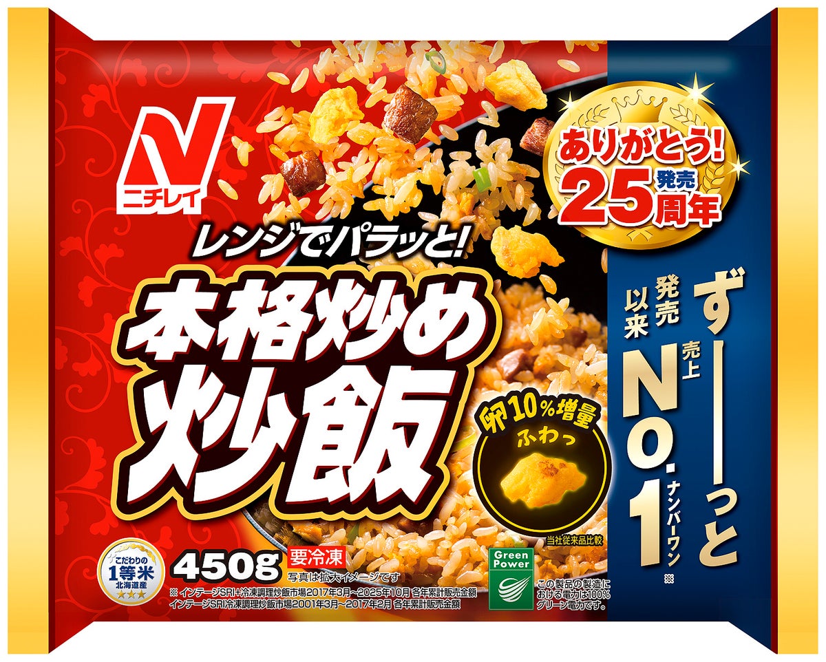 株式会社ニチレイフーズ(代表取締役社長:竹永雅彦、以下「ニチレイフーズ」)の代表商品である、ニチレイ『本格炒め炒飯(R)』は、2026年3月に「発売25周年」を迎え、「発売以来25年連続売上No.1(※1)」を達成いたしました。さらに「2025年の冷凍食品全体における購買金額No.1(※2)」も達成し、ニチレイ『本格炒め炒飯(R)』は、3つの「25年」が示す信頼と責任を積み重ねながら、まさに「日本の冷凍食品の代名詞」ともいえる存在へ進化いたしました。これもひとえに多くの生活者のご愛顧の賜物と、心より御礼申し上げます。