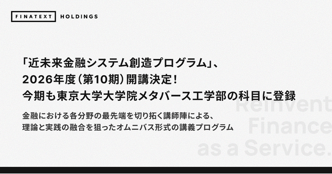 次世代金融インフラの提供を通して組込型金融を実現し、金融がもっと暮らしに寄り添う世の中をめざす株式会社Finatextホールディングス(本社:東京都千代田区、代表取締役社長CEO:林 良太、以下「Finatextホールディングス」)は、近未来の金融システムを創る中核人材の育成を目的として2017年から開講している「近未来金融システム創造プログラム」(プログラム統括責任者:赤井厚雄)を、2026年度も開講することをお知らせします。