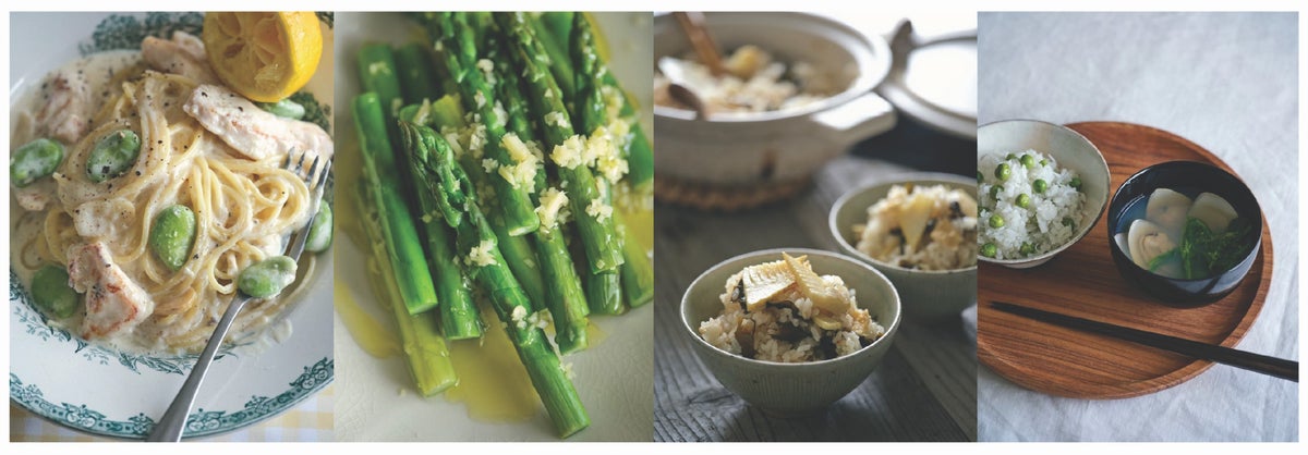 (左から)そら豆と鶏むねのレモンクリームパスタ、アスパラガスのしょうが酒蒸し、たけのことわかめの炊き込みごはん、豆しらすごはん&菜の花とはまぐりのお吸い物