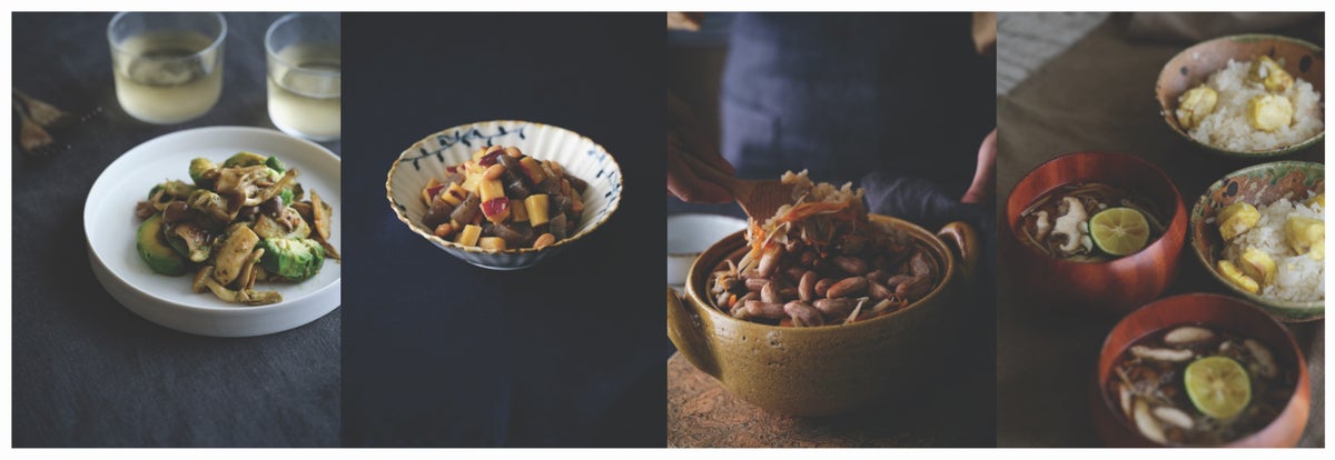(左から)焼ききのことアボカドのバルサミコ酢マリネ、さつまいも入り三目豆、落花生の炊き込みごはん、栗ごはん&きのこ汁