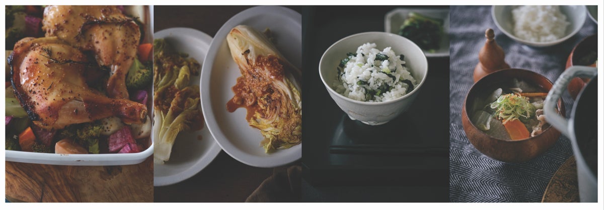 (左から)骨つきチキンと冬野菜のロースト、白菜ステーキ、菜飯、我が家の豚汁