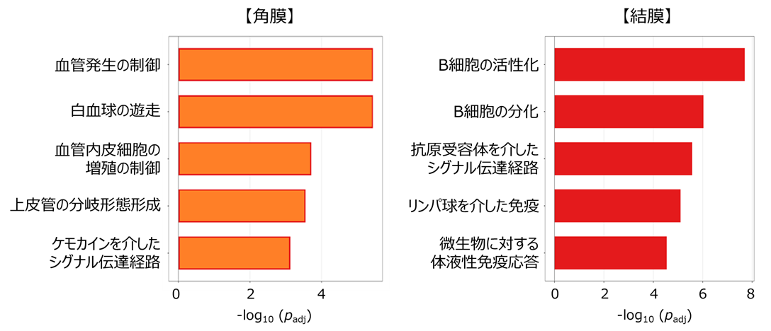 老齢モデルおよび欠損モデルの角膜・結膜の遺伝子発現について、若齢モデルと比較して共通して上昇した遺伝子群を抽出し、遺伝子エンリッチメント解析を実施しました。これは、「どのような機能や生物学的経路に関係する遺伝子が多く含まれているか」を調べる解析方法です。横軸は「補正後p値」を示し、値が大きいほど有意です。(ロート製薬研究所実施)