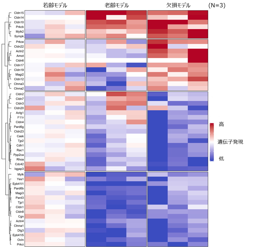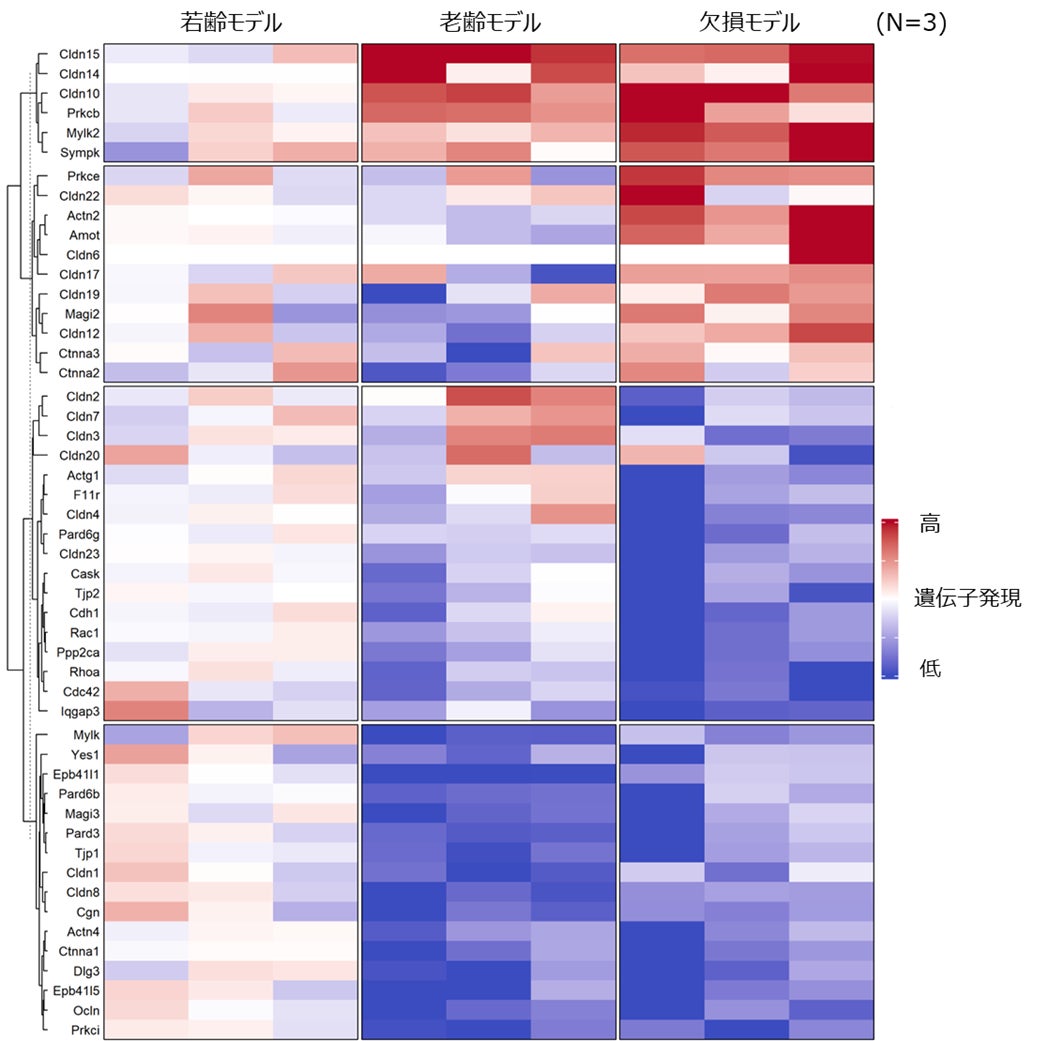 若齢モデルと比較して、老齢モデルおよび欠損モデルの角膜・結膜に共通して発現が低下した遺伝子を抽出し解析しました。その結果、結膜の表面(結膜上皮)のバリア機能に関わる遺伝子群が低下していることが分かりました(図2)。すなわち、細菌や抗原に暴露された際の防御力が低下している可能性が考えられました。