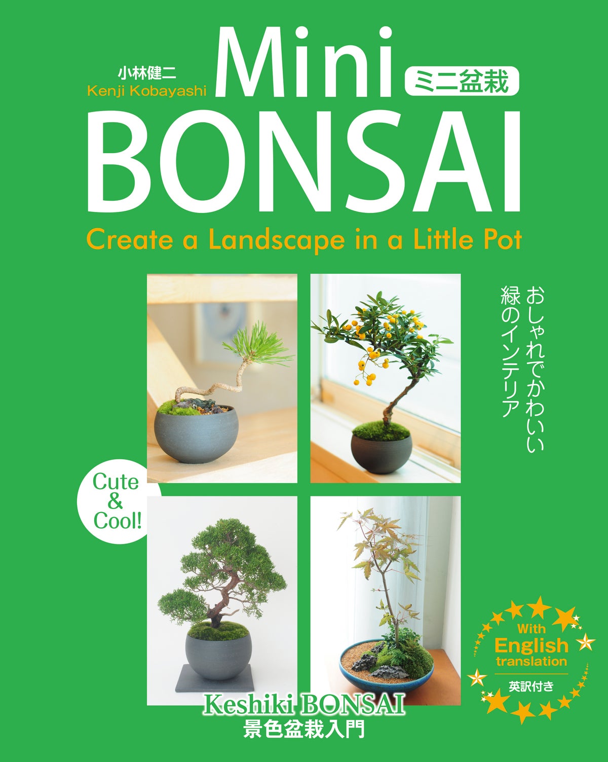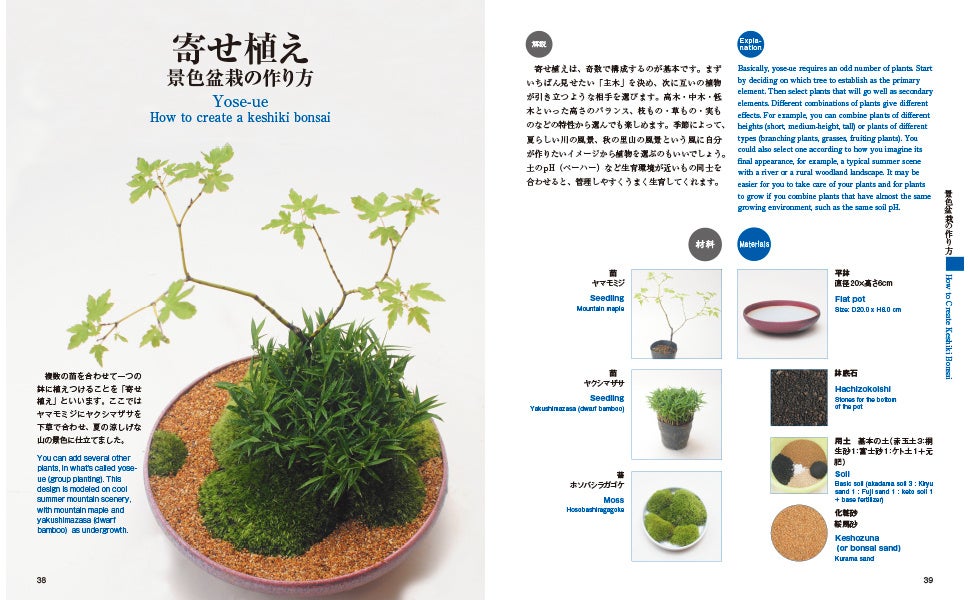本書は、ビギナーでも楽しめる“ミニ盆栽”の作り方や育て方を、英語対訳つきで丁寧に解説した入門書です。自由が丘に店を構える人気盆栽店「品品(しなじな)」が監修し、必要な道具、鉢、土や苗の選び方から、一本もの、寄せ植え、苔盆栽、苔玉、石つき盆栽など全18作品を写真で紹介しています。海外の方へのギフト需要にもぴったりの一冊です。