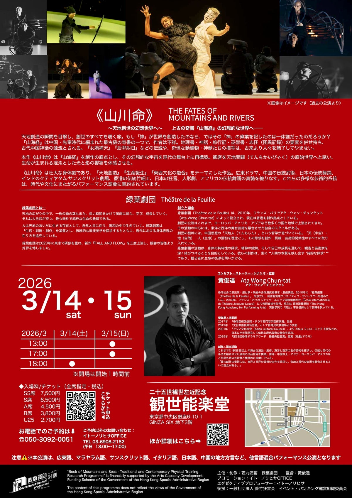 本公演は、香港を拠点に国際的な舞台芸術活動を展開、2025年「第33回香港ドラマアワード 最優秀監督賞」を受賞した演出家 アタ・ウォン・チュンタット(黄俊達 / Ata Wong Chun-tat)による代表作『山川命 - THE FATES OF MOUNTAINS AND RIVERS』の来日公演が、2026年3月14日(土)・15日(日)の2日間、東京・銀座の二十五世観世左近記念観世能楽堂にて決定。