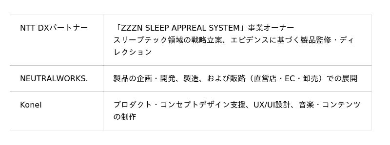 現代社会における「質の高い睡眠」へのニーズが高まる中、NTT DXパートナーは「ZZZN SLEEP APPREAL SYSTEM」のプロジェクトのオーナーとして、これまでスリープテックを活用した多角的な異業種連携を推進してきました。 一方、ゴールドウインは「NEUTRALWORKS.」などのブランドを通じて、人間のコンディショニングを支える高度なアパレル技術を蓄積してきました。 この両社の強みに、Konelの「感性と技術を繋ぐ体験設計」を掛け合わせることで、単なる衣類を超えた「自律的なリカバリーを促すシステムとしてのウェア」を開発する運びとなりました。経済産業省の「PHR(Personal Health Record)社会実装加速化事業」などで培われた知見を、「NEUTRALWORKS.」の製品開発プロセスに統合することで、科学的根拠に基づいた次世代のライフスタイル提案を加速させます。