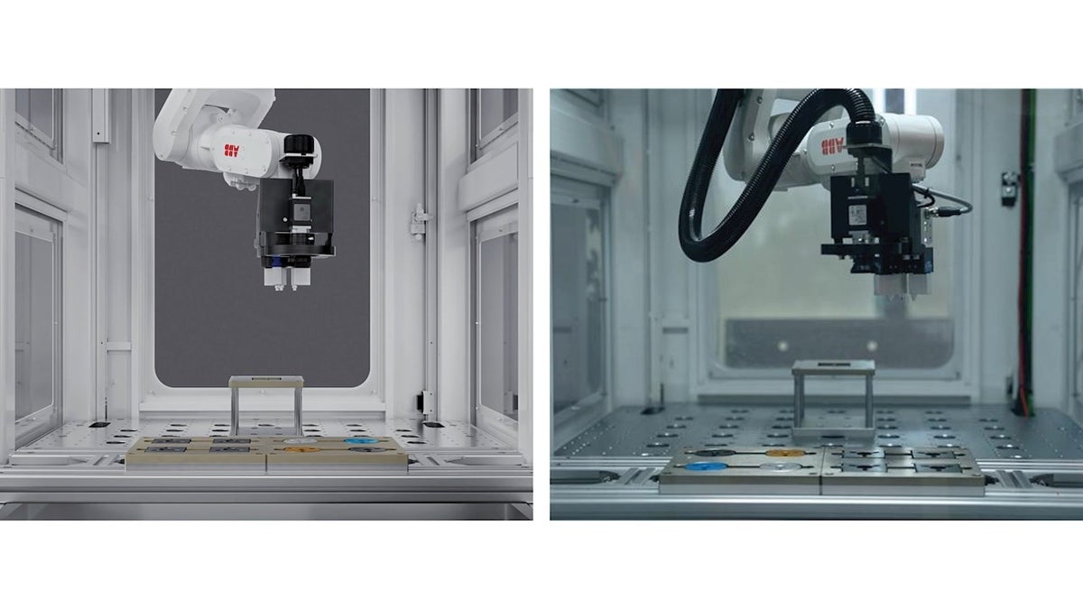 新しいABB Robotics RobotStudio(R) HyperReality(左)と、同じロボットセルの実写画像との比較