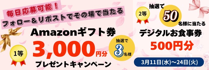 あわせて2026年3月11日(水)午前11時~2026年3月24日(火)の期間に「宮本むなし公式Xフォロー&リポストキャンペーン」を実施いたします。宮本むなしの公式Xアカウントをフォローし、キャンペーン投稿をリポストすることで期間中毎日応募でき、その場での抽選でAmazonギフト券3,000円分が3名様、定食屋宮本むなし店内でご利用いただける500円分のデジタルお食事券が50名様に当たるキャンペーンです。ぜひこの機会に宮本むなし公式Xのフォロー&リポストでのご参加をお待ちしております。