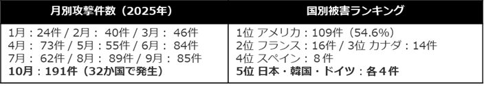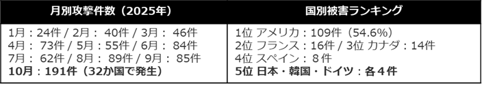 国別被害ランキングでは、日本・韓国ともに「Qilin」による被害が4件で同率5位となっています。報告書は「最近では、韓国および日本企業をターゲットとした攻撃が著しく増加している」と明記しており、両国に対する脅威の高まりは今後も注視が必要です。なお、2025年10月には単月191件と過去最多を記録しており、攻撃ペースの加速は顕著です。