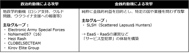 2025年の大きな変化として、従来は社会的・政治的主張を動機に活動していたハクティビストグループが、金銭的利益をも追求する攻撃モデルへと転換しつつあります。動機の複合化により攻撃の予測が困難になり、業種・規模を問わずあらゆる企業が潜在的な標的となる状況が生まれています。